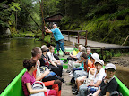 Teď zase hurá do kopce do Vysoké lípy, přes dalších tisíc kamenných schodů. Odsud na vyhlídku Ptačí kámen a pak zase dolů do úžasné Divoké soutěsky. Kaňonem pokračujeme až k přívozu. Ten pendluje mezi dvěma stanicemi, na obou stranách je zvoneček a dá se případně zazvonit, aby přívoz přijel. My jsme zvonit nemuseli, po chvilce se objevil sám. Dokonce se nahromadilo i více lidí. Mezi nimi i nějací Němci, nicméně pan přívozník se s nimi nedokázal domluvit, když paní po něm chtěla vrátit půl eura, jelikož zaplatila dvoueurovkou. Takže jsem dělal překladatele i když německy neumím ani slovo. Loďkou se za vyprávění příběhů o soutěsce posouváme k Mezné. Odsud to jsou dvě hodinky k Pravčické bráně.
